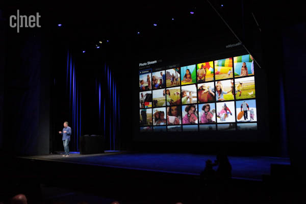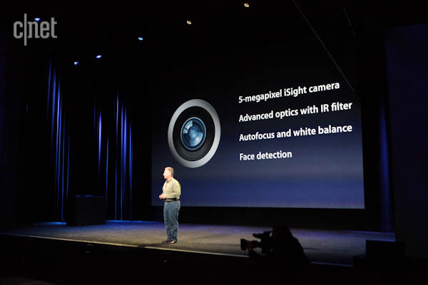 Feature number 2: New camera. 5-megapixel sensor, using some of the same tech that’s in the iPhone 4S camera. Schiller throws up a bunch of photos taken on it, and they look pretty good. Includes face detection too.