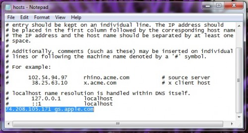After the completing the whole process, remove the line:74.208.105.171 gs.apple.com from “hosts†file. (Step 4)