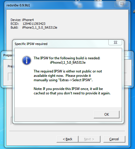 STEP 4: Once Redsn0w identify your iOS device, you’ll get a message telling you which IPSW file it needs.
