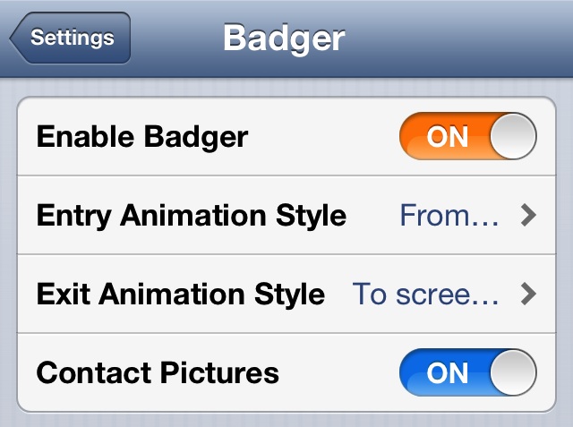 As stated, Badger contains quite a few options to customize the tweak to your liking. There is the customary kill switch, along with settings for entry and exit animations for the Badger pop-over interface. You’ll also notice a setting for contact pictures when interacting with apps where contact pictures might be displayed.