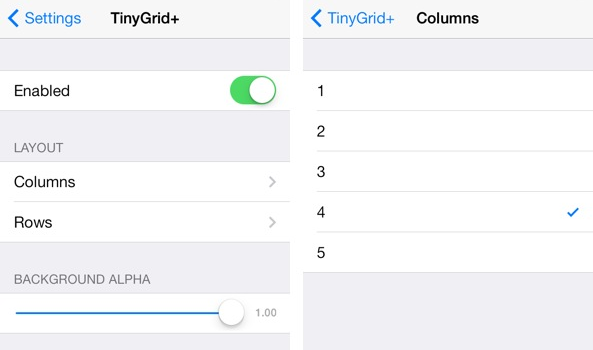 Once installing the tweak on your iPhone, go to the tweak’s settings menu where older icons are set to a 2×2 grid automatically. Head over to the stock Settings app to find TinyGrid+’s preference panel for configuration. The layout section is where you’ll adjust the number of app icons that appear inside a folder on the Home screen. You can specific the number of columns (1-5) and the number of rows (1-5).