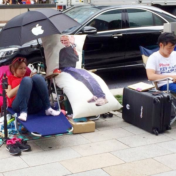 A tweet from Steve Kapner reveals a Steve Jobs pillow sitting in line in front of the Apple Store in Ginza, Tokyo, Japan: