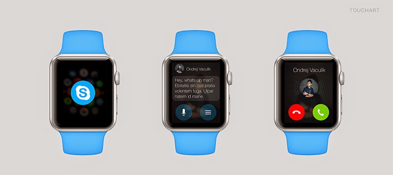 The Skype app for Apple Watch design shows how someone could answer a call or reply to a message on Skype using the Apple watch.