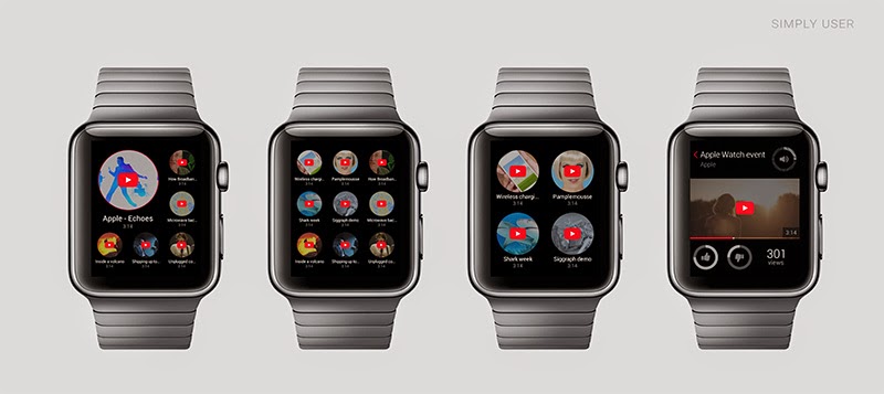 The mockup of the YouTube app for Apple Watch shows a grid of circular thumbnails. Tapping on the thumbnail will play the video. You can tap on the screen to pause the video, which reveals YouTube’s iconic red play button, along with an option to like or dislike the video, and also see how many times the video has been viewed. You can also tap on the back arrow to go back to the grid view.