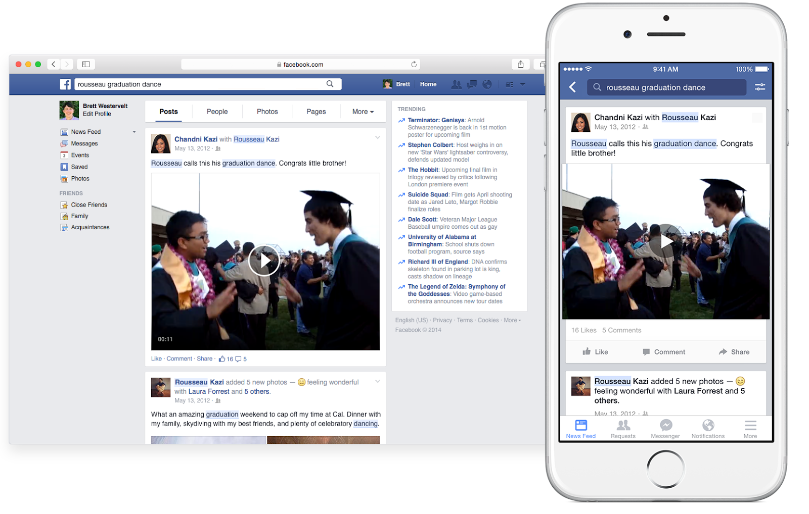 “With a quick search, you can get back to a fun video from your graduation, a news article you’ve been meaning to read, or photos from your friend’s wedding last summer,†boasts Facebook.