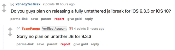 Without a doubt, people seem to agree that the hassle of side-loading the jailbreak app is too much of a pain to have to do every time the certificate expires. Unfortunately for those waiting on an untethered jailbreak, Pangu has confirmed on Reddit that one for iOS 9.3.3 is not being worked on, so you might not want to hold your breath: